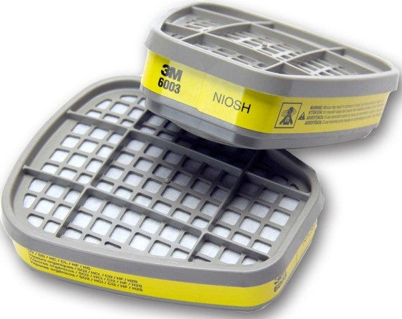 The 3M™ Organic Vapor/Acid Gas Cartridge 6003 helps provide organic vapor and acid gas protection in a variety of environments. When properly used with an approved 3M respirator properly fitted, this respirator cartridge helps provide respiratory protection from certain organic vapors, chlorine, hydrogen chloride, sulfur dioxide, chlorine dioxide, hydrogen sulfide, or hydrogen fluoride. The cartridge may be used for vapor concentrations up to 10 times the Permissible Exposure Limit (PEL) with half facepieces or 50 times PEL with quantitatively fit tested full facepieces. Recommended applications for the cartridge include assembly and mechanical, batch-charging, change-overs, chemical dispensing, clean-up, cleaning, handling, painting, parts cleaning, pesticide application, powder, and seal coating. Inventory needs and training requirements for safety equipment are reduced because this respirator cartridge selection works for many different applications. This cartridge is commonly used in the following industries: agriculture, aluminum reduction, chemical manufacturing, laboratories, petrochemical, pharmaceuticals, pulp and paper, and utilities. This organic vapor and acid gas cartridge works with 3M™ Half and Full Facepieces 6000, 7000 and FF-400 Series with bayonet holders or 3M™ Scott™ AV-3000 HT and AV-3000 SureSeal facepieces with 3M™ Scott™ AV-632 Bayonet Adapter. The cartridge is NIOSH (National Institute for Occupational Safety and Health) approved for environments containing certain organic vapors and acid gases. This cartridge is not for use in environments that are immediately dangerous to life or health (IDLH). The cartridge has been assigned the color code “Yellow” in the NIOSH system. Breathing organic vapors or acid gases can pose a risk to your health. NIOSH, a Federal government regulatory agency, has tested and approved the 3M™ Organic Vapor/Acid Gas Cartridge 6003 to help reduce exposure to certain organic vapors and acid gases.