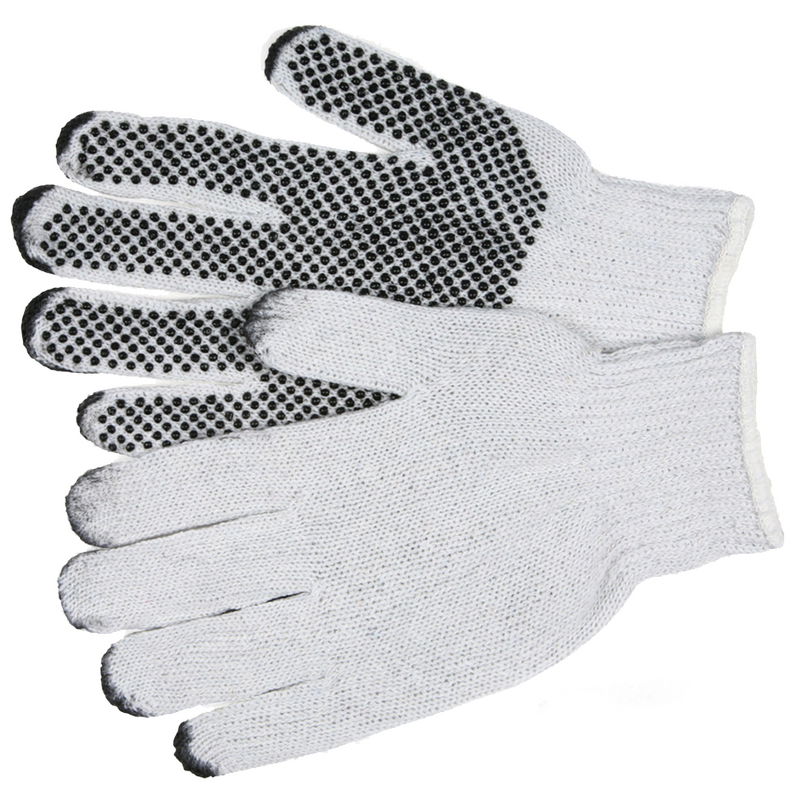 Gloves String Knit PVC DOT Knit Poly/Cotton Blend. Economical gloves keep hands warm while working in the warehouse. Use alone or as liners. Over 250 grip dots are cured to the palm side of the glove, giving our Sure Grip(r) gloves outstanding abrasion resistance and greatly increased grip on wet and dry surfaces.